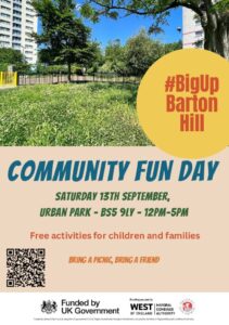 The #BigUpBartonHill Community Day took place on Saturday 13 September 2025 in the Barton Hill Urban Park on Morley Road.This free community day was organised by In Bristol Studio in collaboration with a group of local organisations, groups and service providers that make up the #BigUpBartonHill Network – see below for details of all the groups and organisations involved.
